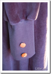 Ermene skulle egentlig lages av vintage-stoffet. Dvs, jeg laget to ermer, men tenkte feil, så de passer min arm, som er en str S og ville nok ikke passet til en størrelse M, da de var litt trange for meg. Jeg valgte da heller å bruke marineblå ribb, og med tanke på at hun er musiker og spiller fele, er det nok mye mer behagelig for armene å ha myk ribb. Med god hjelp av min kjære, har jeg trukket knapper med vintage-stoffet og festet på ermene. Det er første gang jeg har trukket knapper med stoff selv, og det var ikke helt enkelt å feste bakstykket, fordi at stoffet er så tykt og grovt, at det bare fliset seg.